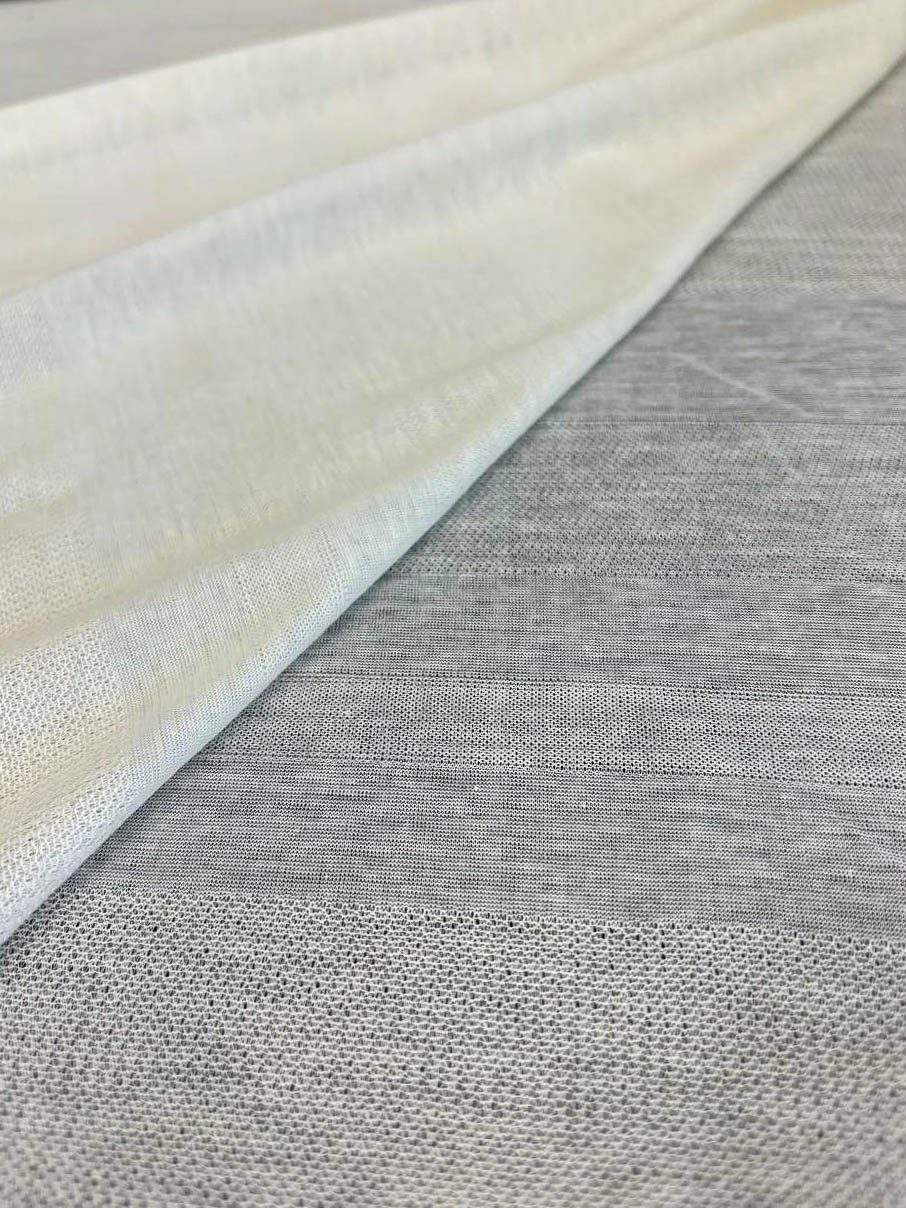 Трикотаж Dondi Состав: 100% хлопок Ширина: 123 см Производство: Италия Описание: цвет ваниль, жаккардовый, визуально шелковистый, при большом растяжении деформируется, но легким движением руки ткань возвращается на место, полупрозрачный, подойдут на лонгсливы, футболки
