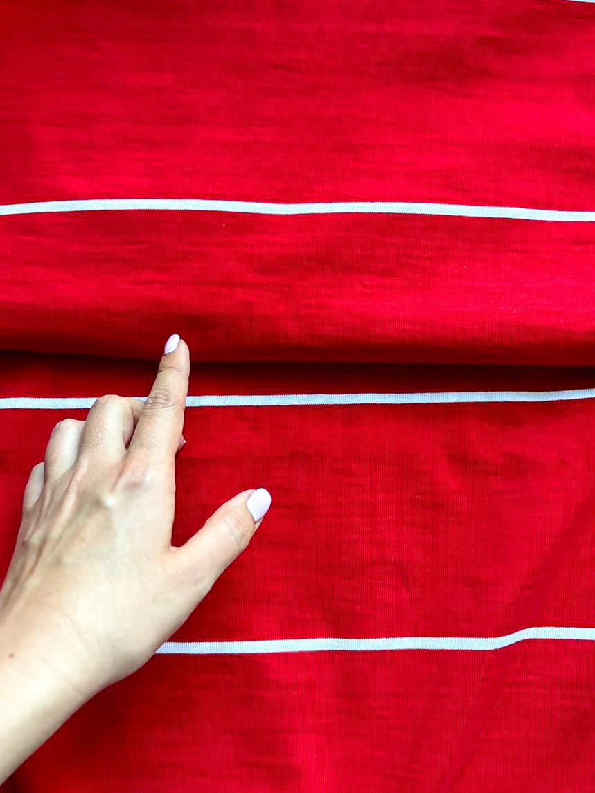 Трикотаж Dondi Состав: 100% хлопок Ширина: 190 см Производство: Италия Описание: цвет ярко-красный в сочетании с белой полосой, трикотаж плотный, полоса горизонтальная, между полосами 12 см, не деформируется