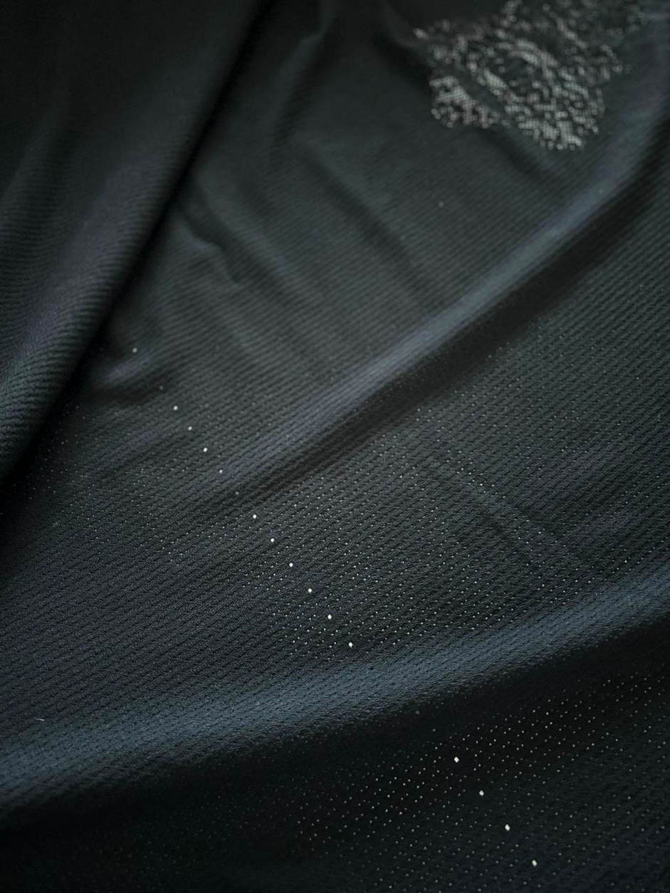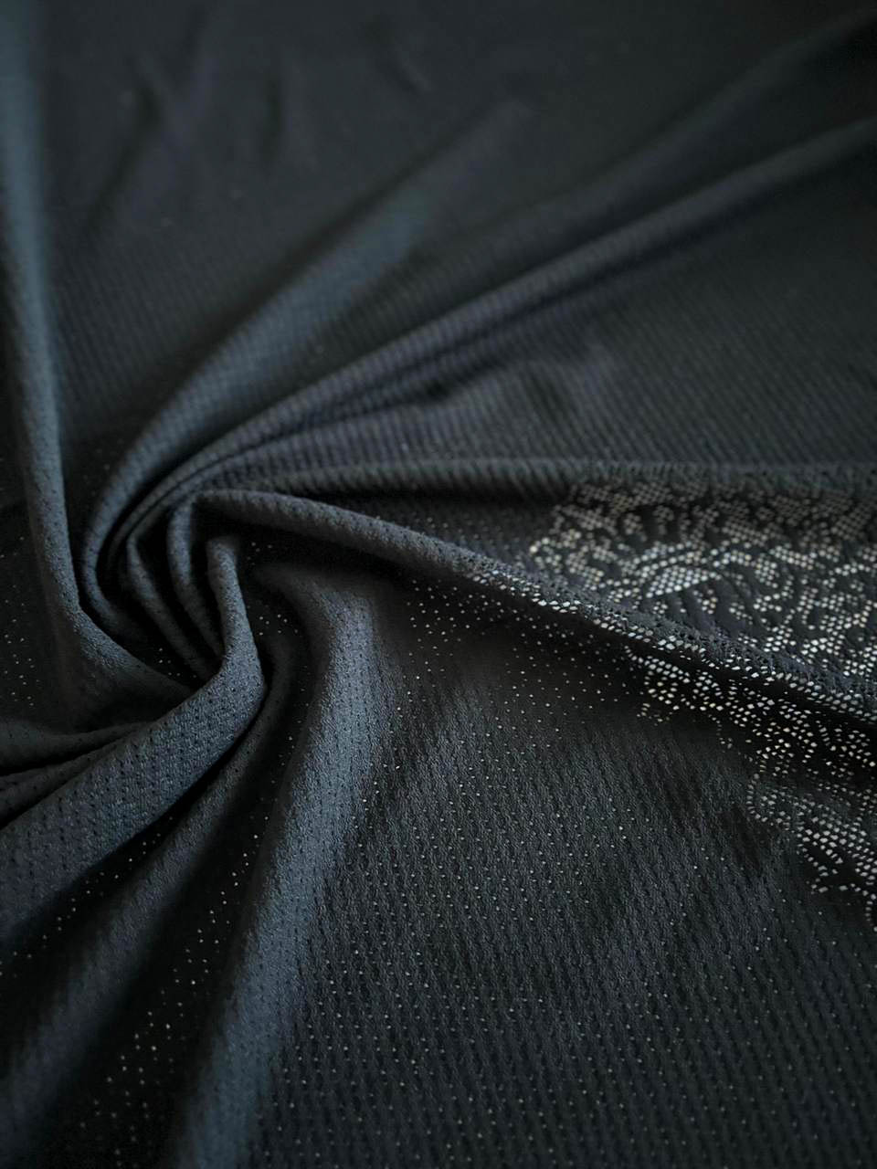 Трикотаж перфорированный Richmond Состав: полиэстер, эластан Ширина: панель 127 см * 96 см Производство: Италия Описание: цвет черный, мягкий, пластичный, перфорация с логотипом Richmond, на купоне один логотип
